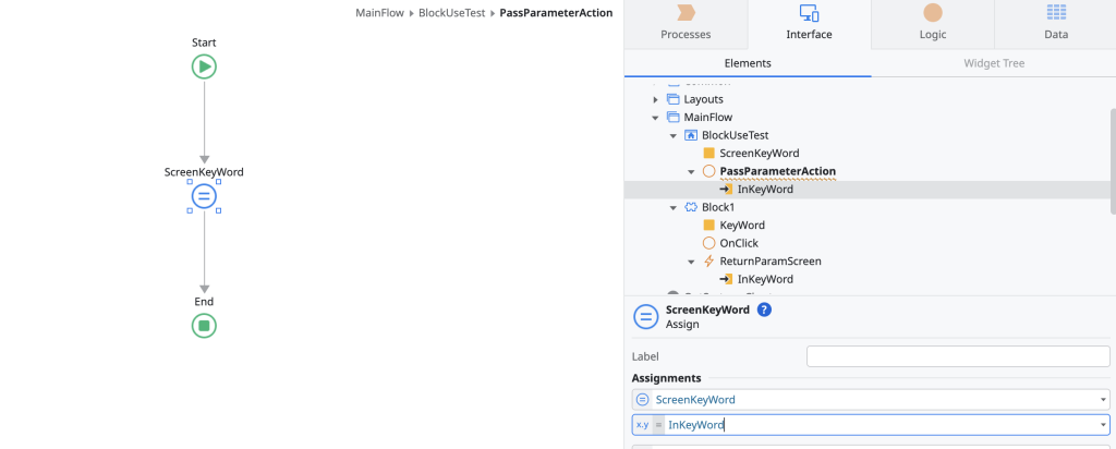作成したAction内に「Assign」を配置してBlockから受け取った値を格納する変数にClientActionのInput Parameterをアサインします。
