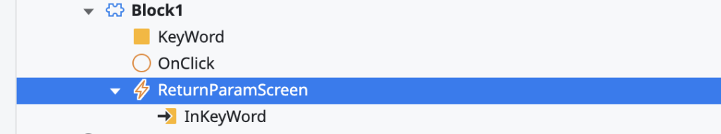 次に今作成したEventを「Button」のOnClick Actionに配置します。InputParameterにはBlockで入力された値を格納している変数を設定します。