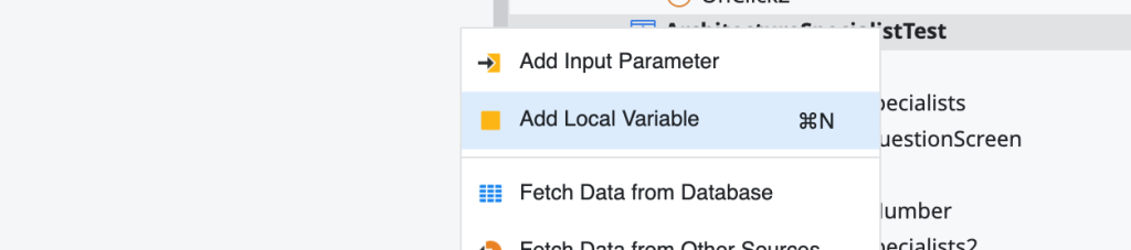 画面上で右クリック→Add Local Variableを選択し、任意の変数名、型をLongInteger、DefaultValueを1に設定して確定します。主は変数名を「DisplayQuestionNum」としました。
