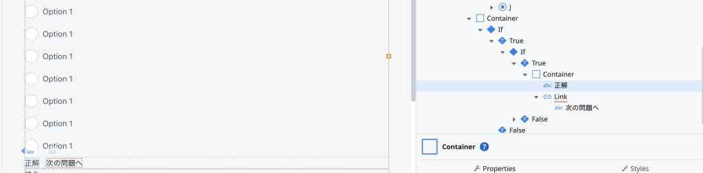 先ほど作成した「正解」の文言の横に「次の問題へ」と記載したLinkを配置し、場所を整えます。