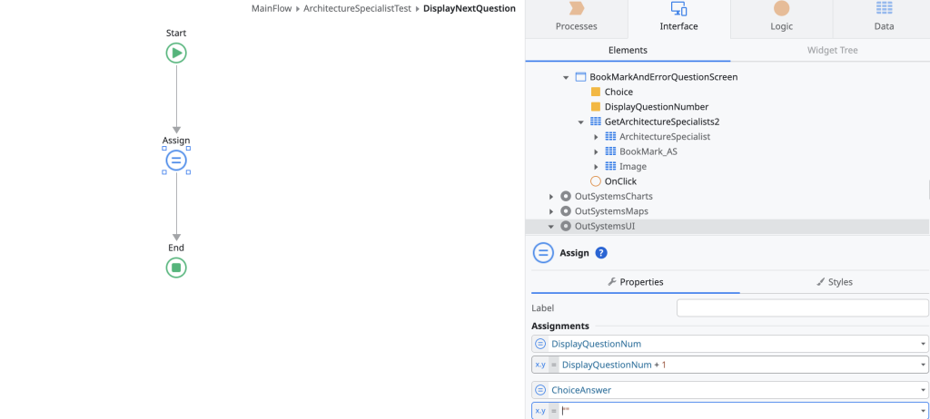 先ほど配置した「Link」が赤くなっていると思うのでダブルクリックすると新たにアクションが作成できます。任意の名前をアクションにつけたらAssignでDisplayQuestionNumをインクリメントしてあげましょう。また、問題が変わるごとにユーザーが選択した選択肢をリセットもしてあげましょう。