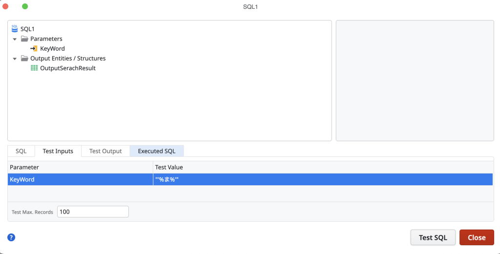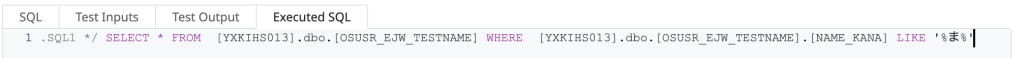Test Valueに「”‘%ま%'”」を設定(画像1枚目)して実行すると検索結果は0件になってしまっています。(画像2枚目)SQLの実行結果(画像3枚目)をみても文字化けとかないように見えるのですが上手くいっていないことがわかります。