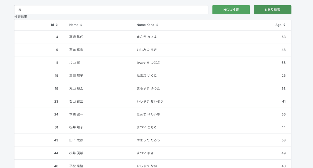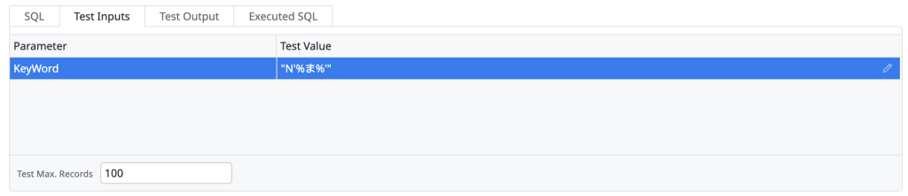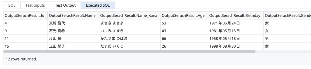 今度はTest Valueに「”N‘%ま%'”」を設定(画像1枚目)して実行すると検索結果は12件になりました。(画像2枚目)SQLの実行結果(画像3枚目)をみるとさっきと違いNがついています。